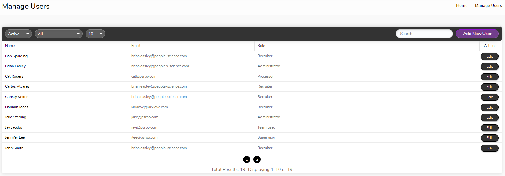 To edit a User click on the Edit button to the right of each user name. This can be used to make a user inactive in the system or to add a secondary role if one wasn't already added when the user was created.